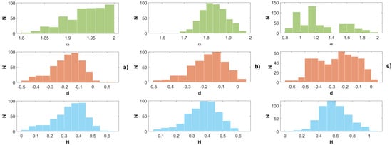 Estimation of FLSM parameters in the form of their histograms after simulation of the segmented diffusion trajectories having (a) normal confined segments; (b) Laplace confined ones; and (c) Linnik confined ones.