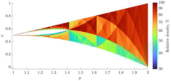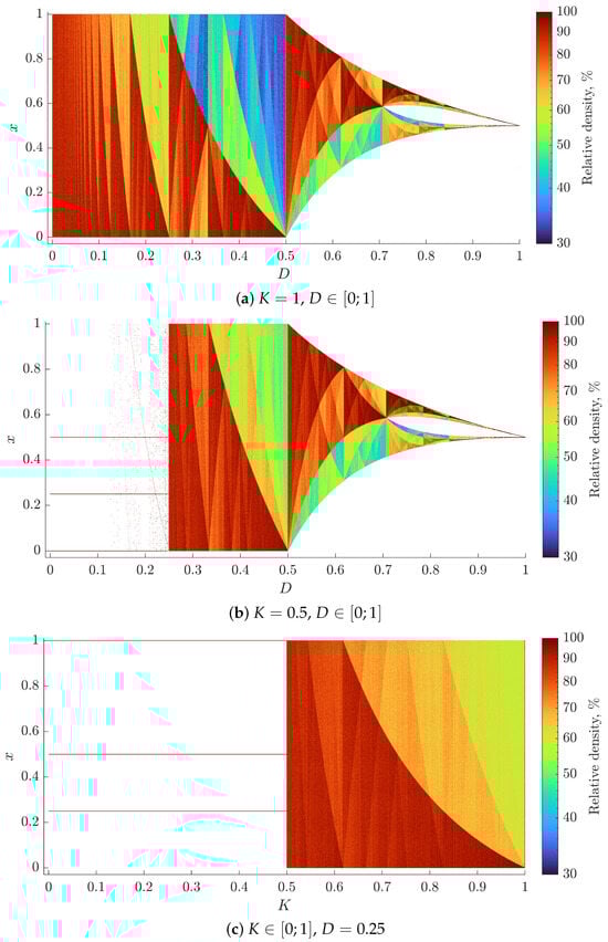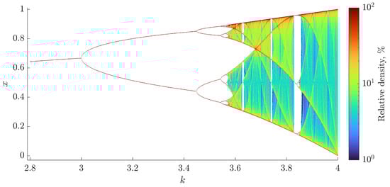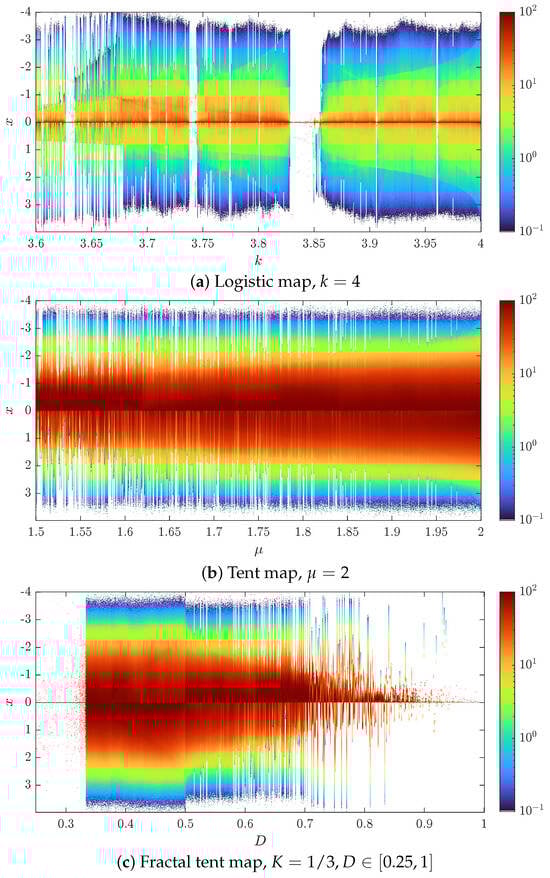 - Moysis, L.; Lawnik, M.; Volos, C. Density-Colored Bifurcation Diagrams—A Complementary Tool for Chaotic Map Analysis. Int. J. Bifurc. Chaos 2023, 33, 2330036. [Google Scholar] [CrossRef]