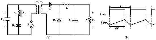 Circuit of forward converter and its operating principle. (a) Main circuit; (b) Waveforms of drive signal and inductor current.