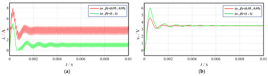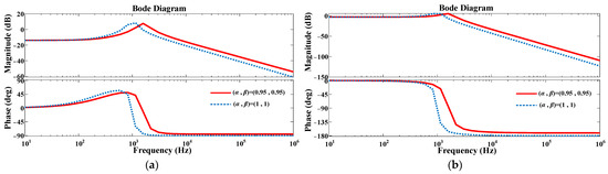 The bode diagrams of and with (α, β) = (1, 1) and (α, β) = (0.95, 0.95), respectively, are shown in Figure 7. The transfer functions and derived from the state-space averaged model are provided in (27) and (34), respectively. The majority of the differences seen in the circuit models can be attributed to adjustments made to the fractional-order inductors and capacitors. When compared with the integral-order model of the forward converter, due to the fractional-order properties of the impedance chain, the amplitude-frequency characteristic curve of the fractional-order model shifts to the right, and the phase-frequency characteristic curve exhibits a leading phase angle, which suggests a superior dynamic performance and stability for the fractional-order model of the forward converter.