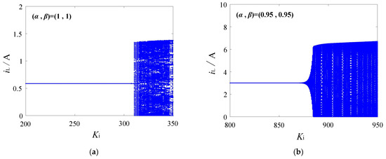 Initially, Ki in the PI controller is used as the bifurcation parameter, and the bifurcation diagram of the forward converter for (α, β) = (1, 1) is shown in Figure 10a. When (α, β) = (0.95, 0.95), as illustrated in Figure 10b, similar to the integral-order forward converter, as Ki changes, the system exhibits lower-frequency oscillation. The system’s motion transitions from a fixed point to periodic oscillation. As the orders decrease, the bifurcation point shifts backward, indicating that the stable parameter domain enlarges.