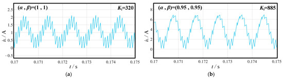 To further describe the low-frequency oscillation phenomena of the fractional-order forward converter, Figure 11 presents the time-domain waveform of the inductor current at the bifurcation point. Figure 11a shows the time-domain waveform of the inductor current iL for a forward converter with (α, β) = (1, 1) when Ki = 320. Figure 11b shows the time-domain waveform of the inductor current iL for a forward converter with (α, β) = (0.95, 0.95) when Ki = 885. It can be observed that when the converter operates at the bifurcation point, due to the occurrence of low-frequency oscillations, the inductor current iL drops to zero during certain switching cycles, putting the system in a critical state of continuous inductor current mode. That is, the system alternates between continuous conduction mode (CCM) and Discontinuous Conduction Mode (DCM). When the converter experiences low-frequency oscillations, the ripple of the inductor current significantly increases, worsening the operating performance of the system.
