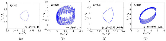 Figure 12 shows the phase diagram formed by the inductor current and the output voltage. Using Ki as the bifurcation parameter for a forward converter with (α, β) = (1, 1), when Ki < 320, the converter operates in a period-1 stable manner, as illustrated in Figure 12a, where the phase diagram is a closed, smooth loop. When Ki ≥ 320, the system undergoes low-frequency oscillations, forming a limit cycle in the phase diagram, as shown in Figure 12b. Similarly, for a forward converter with (α, β) = (0.95, 0.95), when Ki < 885, the system operates stably, forming a closed, smooth loop in the phase diagram, as depicted in Figure 12c. When Ki ≥ 885, the converter exhibits low-frequency oscillation behavior, and the corresponding phase diagram shown in Figure 12d is a limit cycle. The appearance of limit cycles in the phase diagram of DC-DC converters is indicative of low-frequency oscillations in the circuit. It is observed that when the circuit undergoes low-frequency oscillations, both the inductor current and the output voltage ripple significantly increase. These observations are consistent with the conclusions drawn from the bifurcation diagrams and time domain graphs.