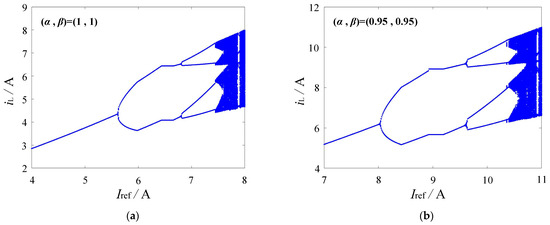 The reference current is used as a parameter to describe the bifurcation. As the Iref varies, the bifurcation diagram for a forward converter with (α, β) = (1, 1) under continuous inductor current mode is shown in Figure 15a. Figure 15b shows the bifurcation diagram for a forward converter with (α, β) = (0.95, 0.95) under continuous inductor current mode. It is observed that as Iref changes, the forward converter first passes through period-1, and then period-2, followed by period-4, and it eventually reaches the chaotic mode. When the system is in chaos, the inductor current iL no longer has periodicity and exhibits large fluctuations. Comparing Figure 15a and b, the bifurcation points move backward as the order of the fractional-order converter decreases. The fractional-order forward converter possesses a larger stable parameter domain.