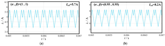 To better observe the period-doubling bifurcation phenomenon of the fractional-order forward converter, Figure 16 illustrates the time-domain waveforms of the inductor current at the bifurcation points for the fractional-order forward converter. Figure 16a shows the inductor current waveform for a forward converter with (α, β) = (1, 1) at Iref = 5.7 A. At this point, the converter is at the bifurcation point, and the circuit operates in a period-2 state. Figure 16b depicts the time-domain graph of the inductor current at the bifurcation point for a forward converter with (α, β) = (0.95, 0.95). When Iref = 8.2 A, the circuit undergoes period-doubling bifurcation, transitioning the system’s motion from period T to period 2T. Period-doubling bifurcation is one of the pathways leading to chaotic behavior. As Iref gradually increases, the fractional-order forward converter transitions to a chaotic state, cascading through the period-doubling pathways.