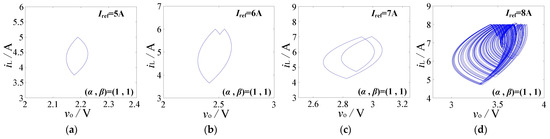 Phase diagrams for the current-mode-controlled forward converter with (α, β) = (1, 1). (a) Iref = 5 A; (b) Iref = 6 A; (c) Iref = 7 A; (d) Iref = 8 A.