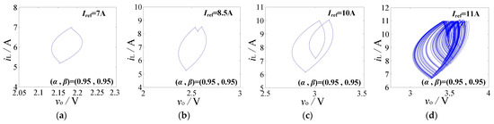 Phase diagrams for the current-mode-controlled forward converter with (α, β) = (0.95, 0.95). (a) Iref = 7 A; (b) Iref = 8.5 A; (c) Iref = 10 A; (d) Iref = 11 A.