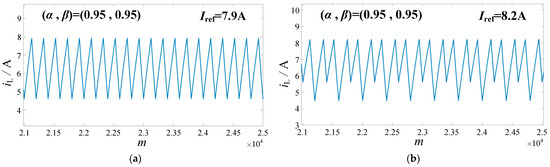 The fractional-order predictor-corrector model is used to describe the states of the forward converter under different Iref values. After m iterations, the waveform of the inductor current can be obtained. Figure 19 shows the inductor current waveforms of the forward converter with (α, β) = (1, 1). As depicted in Figure 19a, when Iref = 5.4 A, the circuit operates in a stable state. When Iref increases to 5.7 A, the inductor current undergoes period-doubling bifurcation, as shown in Figure 19b, and the circuit enters the period-2 state. Figure 20 presents the inductor current waveforms for the forward converter with (α, β) = (0.95, 0.95). At Iref = 7.9 A, the circuit is in the period-1 state, as illustrated in Figure 20a. As shown in Figure 20b, when Iref reaches 8.2 A, the inductor current exhibits period-doubling bifurcation. Clearly, the bifurcation points obtained using the fractional-order predictor-corrector model are consistent with the results of circuit simulations. This indicates that the model can accurately predict the period-doubling bifurcation boundaries of a fractional-order forward converter.