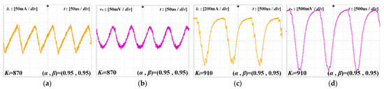 Utilizing the reference current as a parameter to describe bifurcations. By adjusting Iref, the period-doubling bifurcation phenomenon of the forward converter can be obtained. The experimental results are shown in Figure 23. Figure 23a,b shows the experimental results of the forward converter with (α, β) = (1, 1). When Iref = 5.6 A, the circuit is in a stable state. As Iref increases to 6.1 A, the circuit undergoes period-doubling bifurcation, transitioning from a period-1 state to a period-2 state. Figure 23c,d shows the experimental results of the forward converter with (α, β) = (0.95, 0.95). As Iref increases from 7.4 to 7.9 A, the circuit transitions from a stable state to period-doubling bifurcation. It can be observed that when the forward converter experiences period-doubling bifurcation, the inductor current undergoes fission, with the period changing from T to 2T. The experimental results closely correspond to the simulation outcomes, thereby affirming the accuracy and validity of theoretical analysis. As the order of the fractional forward converter decreases, the period-doubling bifurcation point moves backward. This implies that, compared to the integral-order forward converter, the fractional-order forward converter cannot easily enter into period-doubling bifurcation.