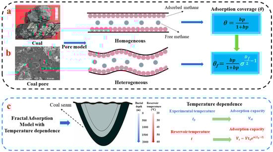 Adsorption principle for coal; (a) conventional Langmuir equation that does not involve the heterogeneous pore structure; (b) fractal equation based on heterogeneous pore structure; (c) fractal adsorption with temperature dependence.
