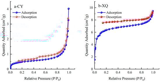 According to the original data from the low-temperature liquid nitrogen adsorption experiment, an adsorption loop line is plotted. Figure 3 shows that the actual adsorption loop line of the CY coal sample exhibits minimal magnitude, indicating that the pore structure of coal primarily consists of nearly closed-end breathable pores with a diverse range of shapes and sizes. At lower relative pressures, there is an overlap between the adsorption and desorption branches, while the adsorption loop emerges at higher relative pressures. In contrast, for XQ coal samples, both the adsorption and desorption branches remain horizontal and parallel to each other across a wide pressure range, suggesting a significant presence of micropores in the coal.