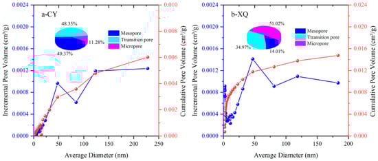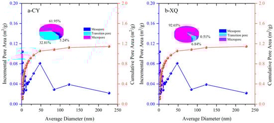 The total pore volume of the CY coal sample (gas coal) is 0.006019 mL/g, with transitional pores being the dominant type, accounting for 48.35%. Mesopores constitute the second largest fraction at 40.37%, while micropores have the smallest proportion at 11.28%. The total pore volume of the XQ coal sample (coking coal) is 0.01476 mL/g, with micropores being predominant at 51.02%, followed by transitional pores at 34% and with the medium-sized pores having the smallest proportion.