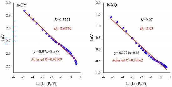 The fractal dimension (Df) for pore size is the one of fundamental parameters for establishing the fractal adsorption model with temperature effect dependence in Equation (22). According to the experimental adsorption data of liquid nitrogen, a statistical relationship was established between LnV and Ln[ln(P0/P)] for two coal samples. Subsequently, the fractal dimension (Df) of the coal samples was calculated using Equation (10). The calculation results are presented in Figure 6. The obtained fractal dimensions for the coal samples were found to be 2.6279 and 2.93, respectively, with corresponding adjusted R2 values of 0.98509 and 0.99062, respectively. These results reveal that the pore structure of the experimental coal sample exhibits distinct fractal characteristics, with a higher complexity observed in the CY sample compared to the XQ sample.