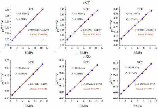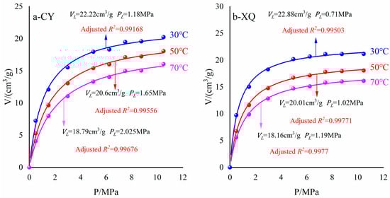 According to Equation (7), the isothermal adsorption curves of CY and XQ samples, as well as VL and PL, at temperatures of 30 °C, 50 °C, and 70 °C, are depicted and summarized in Figure 7.