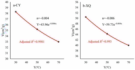 To further investigate the relationship between different temperature conditions and the maximum adsorption capacity of methane, we introduced the attenuation coefficient n to characterize the variation pattern of adsorption capacity with increasing temperature. Due to variations in pore structure among different coal samples, the adsorption attenuation coefficients differed as temperature increased. Based on the calculation results in Section 4.4, an exponential relationship was fitted for the maximum adsorption capacities Vf of both samples at 30 °C, 50 °C, and 70 °C. As shown in Figure 9, CY and XQ coal samples had attenuation coefficients of −0.006 and −0.004, respectively. Compared to XQ coal samples, CY coal samples exhibited a faster decrease in maximum adsorption capacity with increasing temperature.