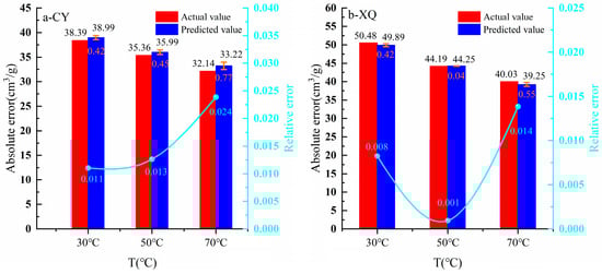 According to the estimation results in Section 4.4 and Section 5.1, the Vf values of CY and XQ coal samples and their attenuation coefficients were substituted into Equation (22) to predict the corresponding Vf at 30 °C, 50 °C, and 70 °C (Equations (26) and (27)), which were then compared with the actual values calculated in Section 4.4.