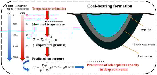 The gas storage capacity of a coalbed methane reservoir is a crucial parameter for estimating the reserves of coalbed methane resources [,]. Additionally, the temperature of the coal reservoir plays a significant role in evaluating its gas storage capacity. Since methane in coal primarily exists in an adsorbed state within the reservoirs [], gas content is typically determined through isothermal adsorption experiments on methane in coal []. However, accurately characterizing the methane adsorption capacity of deep coal reservoirs using experimental methods remains challenging. Therefore, we propose a method to estimate the methane adsorption capacity of deep coal seams. Considering the geothermal gradient of the coal reservoir, it can be observed that every 100 m increase in burial depth leads to a corresponding rise in reservoir temperature by 3 °C []. Hence, we establish the following correlation between burial depth and temperature of the deep coal reservoir: