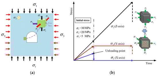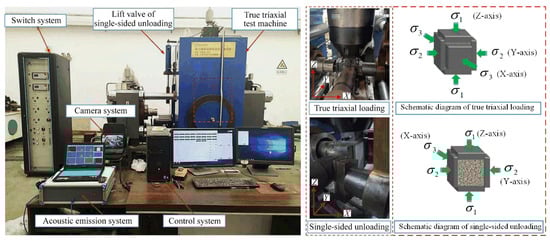 Before the excavation of underground engineering, the original rock mass is in a triaxial stress state (). The activities of engineering excavation will disrupt the original stress equilibrium of the rock mass, leading to the redistribution of the stress field in the rock mass. Specifically, unloading during underground engineering excavation can cause the rock mass to experience uni-directional or bi-directional stress unloading, changing the stress state of the surrounding rock mass from triaxial compression to uni- or bi-directional compression [1,2]. In high-stress environments, stress unloading of the surrounding rock mass may induce geological disasters, such as rockbursts, collapses, and roof falls, which seriously threaten the safety of the engineering project [3]. Hence, it is essential to investigate the mechanical properties, energy transformation, and fracture mechanisms of rocks in true triaxial unloading scenarios to accurately assess and forecast the stability of deep rock projects and ensure the security of deep underground constructions.