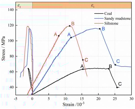 From Figure 4, it is evident that there were significant differences in the stress–strain curves of different types of rocks. These differences can be attributed to inherent differences in their mineral composition, grain size, and structural characteristics. In the context of single-sided unloading conditions, the peak strengths observed in coal, sandy mudstone, and siltstone were 64.68 MPa, 116.13 MPa, and 119.00 MPa, respectively, showing an increasing trend. The peak strains at instability for different types of rocks varied, but the overall trend was that as the axial stress increased, the maximum principal strain, , continued to increase, while the intermediate principal strain, , showed a decreasing trend, indicating dilation. This phenomenon can be attributed to the constant intermediate principal stress during the loading and unloading process, and the Z-direction compression led to X- and Y-direction expansion due to the Poisson effect. In addition, the X-direction unloading surface acted as the primary expansion surface, resulting in the expansion in the Y direction being less than that in the X direction.