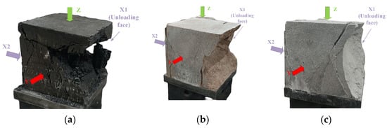 Figure 5 illustrates the variation in macroscopic failure patterns of different rock types under true triaxial unloading conditions. In a single-sided unloading stress state, it was observed that all types of surrounding rock mainly deformed along the direction of the minimum principal stress, X1, while the fracture surface was parallel to the intermediate principal stress Y direction. Rock failure was mainly concentrated near the unloading free surface X1, forming distinct V-shaped failure pits accompanied by a large number of rock fragments and debris. Small V-shaped cracks were also observed near the X2 surface, but no rock detachment was observed. In the middle of the X-direction loading surfaces, mainly shear cracks were present, with fewer fine cracks.