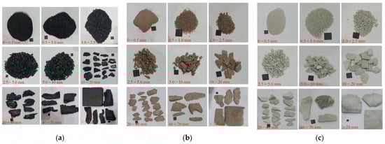 To quantitatively analyze the degree of rock damage for different rock types, fractal dimensions were used for analysis in this study. The advantage of fractal theory lies in its ability to discover potential patterns in disordered geometric bodies, achieving a combination of disorder and order. To assess the effect of unloading on the fracture behavior of different rock types, a sieving tool was used to collect and classify the debris generated in the experiments into nine particle sizes. The specific grades and sieving results are shown in Figure 6. After weighing the debris for each particle size, different fractal dimensions of rock fragments were calculated by using the mass data of debris of different particle sizes with the reference standard of placing a 10 mm black square.