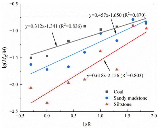 Research has shown that the self-similarity of fragments may only exist in a specific local area [25,26]. When statistical analysis was performed on fragments within a range of 70 mm, the results showed good consistency. Figure 7 shows the relationship between the lg(MR/M) and lgR of fragments after different rock unloading experiments, as well as the linear fitting, as shown in Equation (3):