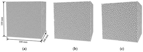 A series of numerical simulations were conducted utilizing the Particle Flow Code software PFC3D, developed by Cundall [34]. Based on the Discrete Element Method, PFC3D is capable of more accurately simulating the microscopic structure and particle interactions of rock and similar granular materials. In PFC3D, a range of contact models are provided, with the linear parallel bond model being widely adopted for effectively reproducing the behavior of rock-like materials during tension or shear fracture simulations [35]. Consequently, this study employed the linear parallel bond model to characterize the bonding between rock particles. The numerical computational model will maintain consistency with the dimensions of laboratory test specimens, specifically a cubic model measuring 100 mm × 100 mm × 100 mm. Figure 8 illustrates schematic diagrams of the different PFC3D models utilized in this study. Three different particle size distributions were considered: dmax/dmin = 1.3, 1.7, and 2.0. The minimum particle size, dmin, was fixed at 1.1 mm. It should be noted that the larger the value of dmax/dmin, the stronger the geometric heterogeneity of the rock.