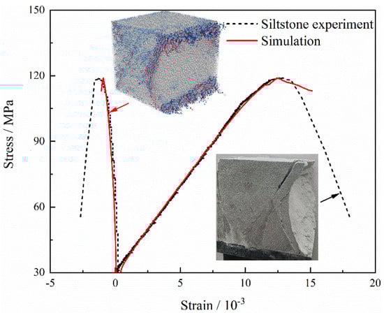 In this study, the triaxial unloading stress–strain curves obtained from laboratory experiments on siltstone were used as a basis for adjusting the micro-parameters. The numerical model used for calibration was a 100 mm cube containing a total of 383,310 particles and 190,168 contact surfaces, with particle radii ranging from 1.1 to 1.9 mm. The micro-parameters were adjusted continuously using a “trial-and-error” method until the macroscopic mechanical parameters produced by the numerical simulation matched those obtained from laboratory experiments. The parameters of the calibrated model are shown in Table 1. Figure 9 compares the stress–strain curves and failure modes obtained from numerical simulations and laboratory experiments. The blue lines indicate shear cracks, while the red portion represents tensile cracks in the numerical model. Figure 9 illustrates that the stress–strain curve of the numerical simulation aligned closely with the experimental curve, and the failure modes were also comparable, indicating that the calibrated micro-parameters in this study effectively reflected the macroscopic mechanical behavior of rock materials in the laboratory. It is noteworthy that during the true triaxial loading–unloading simulation process, the loading was conducted using the force control mechanism built into PFC to align with the experimental setup.