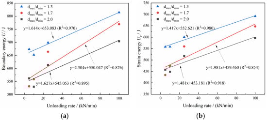 Variation in energy values with an increasing unloading rate at peak stress for different particle size distribution models: (a) boundary energy and (b) strain energy.