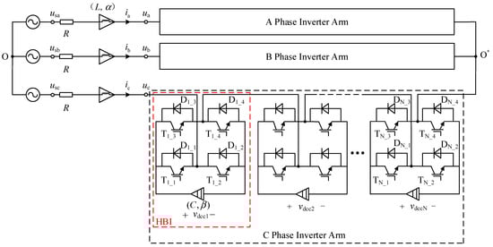 With the development of sustainable energy, the large-scale integration of renewable energy stations, represented by wind and photovoltaic stations, into the grid poses severe challenges to the power quality and stable operation of electrical systems [,,]. Reactive power compensation is one of the methods to improve the power quality of the electrical power system and to maintain its stable operation []. Research and engineering practices have demonstrated that installing reactive power compensation devices at the common connection points of new energy stations significantly improves the quality of electrical power and enhances the stability of power systems [,,]. The cascaded H-bridge multilevel static reactive power compensator (CHM-STATCOM) is a type of power electronic converter commonly used as a source of reactive power. The CHM-STATCOM is characterized by its simple structure, fast reactive power adjustment, desirable output performance, and transformer-less design. It is commonly used in high-voltage, large-capacity situations [,,,].