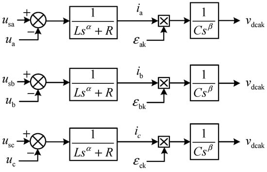 Figure 2 shows the topological structure of the FCHM-STATCOM. In Figure 2, the capacitors and inductors are both fractional-order components. Each phase of the converter arm consists of H-bridge inverters (HBI) connected in series. denote the phase voltages of the three-phase power grid; denote the input current of FCHM-STATCOM; denote the output voltage of FCHM-STATCOM; denote DC side capacitor voltage; R denotes equivalent loss resistance, which is used to modify the active power losses in the AC-side filter reactors and the FCHM-STATCOM during actual operation. L denotes the inductance value of the AC-side filter reactors. C denotes the capacitance value of DC side capacitors; and denote the order of fractional-order capacitors and fractional-order inductors, respectively; denotes the x-th IGBT of the k-th HBI; denotes the x-th freewheeling diode of the k-th HBI; O denotes the neutral point of the power grid; denotes the neutral point of FCHM-STATCOM (For more detailed explanations of the symbols in this paper, see Appendix A).