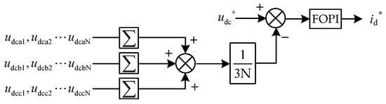 By calculating the total average of the capacitor voltages across all HBI in the three-phase converter arms, the variable can be derived. By inputting the difference between (a variable representing the reference value of the DC voltage outer loop controller) and into the FOPI controller, the output can be obtained. In summary, the DC voltage outer loop of the FCHM-STATCOM controller can be derived, as shown in Figure 8.