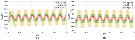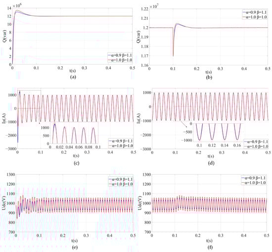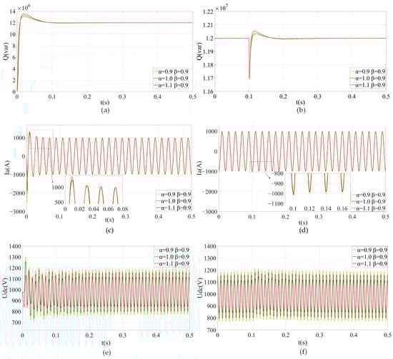 Simulation results of Scheme II. (a) Simulation results of Q during the startup process. (b) Simulation results of Q during the load disturbance process. (c) Simulation results of Ia during the startup process. (d) Simulation results of Ia during the load disturbance process. (e) Simulation results of Udc during the startup process. (f) Simulation results of Udc during the load disturbance process.