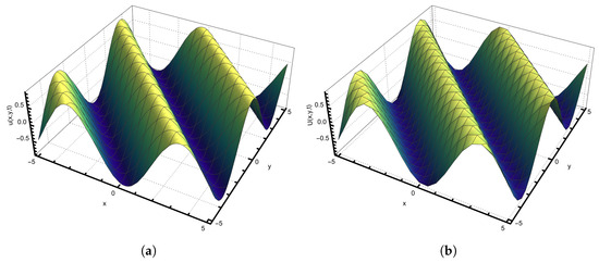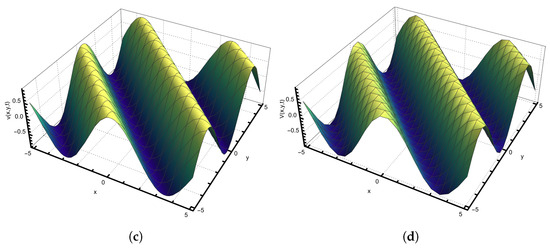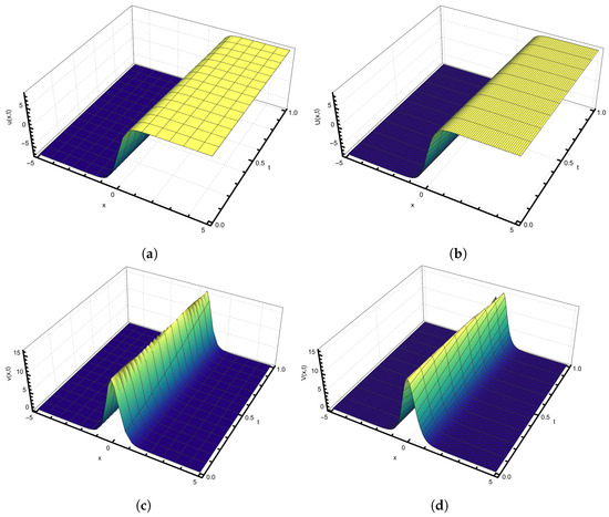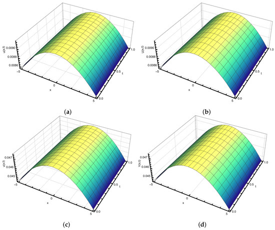 Since the exact solutions do not exist for varied values of λ, we need to confirm the validity of our method by measuring absolute two-step errors and . For the sake of comparison, the constants have been assumed to be and , and the results are listed in Table 3 in comparison to the results of the Chebyshev method [25]. Figure 1 shows the surface graphs of the approximate LRPS and the exact solutions for Equations (41) and (42) when and . These subfigures clearly show that the approximate solutions and are close to the exact solutions.