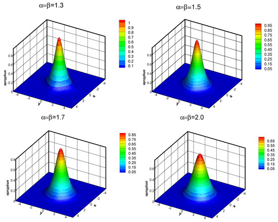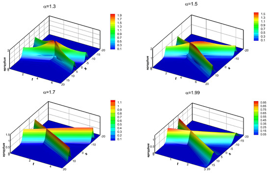 , and as time goes on, the modulus of the wave solution becomes smaller and the wave gets fatter and fatter. The physical shape of the waves can obviously be affected by the fractional derivatives, and a bigger