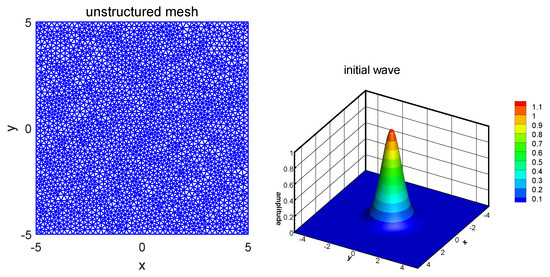 The main purpose of this test is to evaluate the actual performance of the proposed split-step FE scheme in practice, and we conduct the numerical simulation divided into three steps. Firstly, the evolution of the wave over time will be simulated. On a finer unstructured triangular mesh, the initial wave is plotted, which is given in Figure 3 (right). We easily see that its amplitude is nearly one. Letting ,