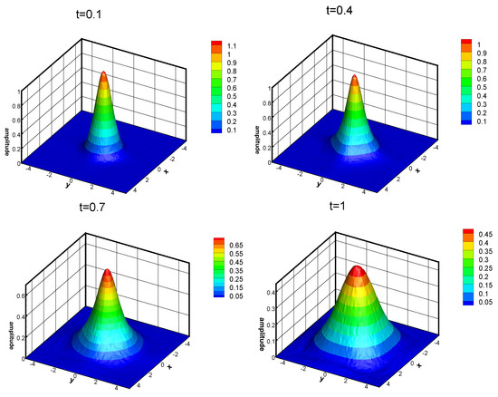 are presented in Figure 5. From these figures, we observe that the wave travels with its size and height being continuously variable. More precisely, the plane wave is centered at origin coordinates with the height being one at