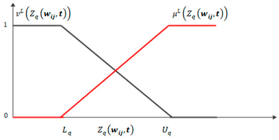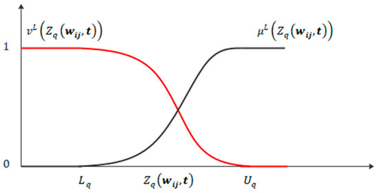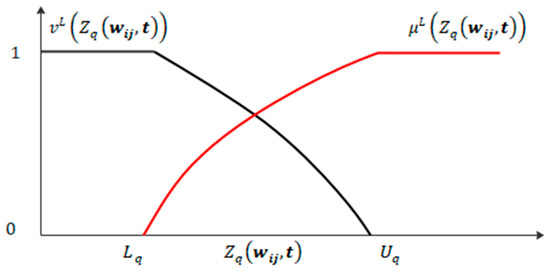 In the literature on solving fuzzy mathematical programming problems, a key assumption is often made about applying a linear membership function (LMF) in the decision-making method. People primarily favor this choice because of its simplicity and ease of implementation. It involves defining the upper and lower bounds of respect for decision parameters. Typically, refs. [17,20,42] represent linear membership and non-membership functions, as illustrated in Figure 2.