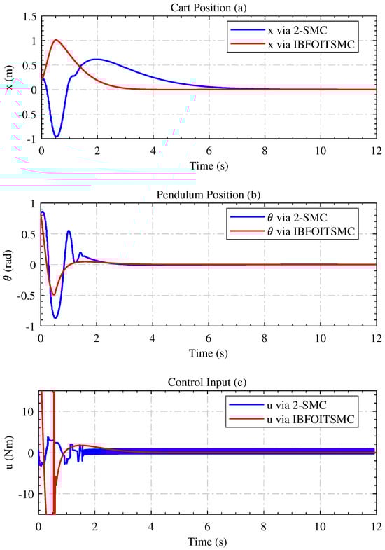where , , u is the applied control input, M is the mass of cart, m is the mass of rod, g is the gravitational acceleration, and l denotes rod length. The coordinate transformation converts the dynamics of the cart–pendulum system Equation (37) into the following equivalent regular form []: