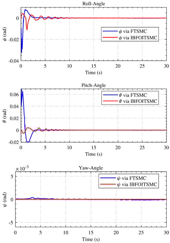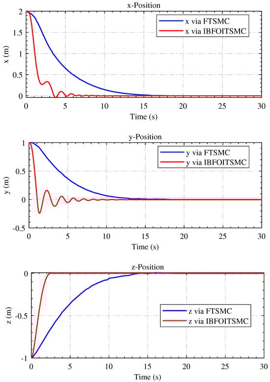 Figure 5 provides a detailed comparison of the reference tracking errors along the x, y, and z axes, illustrating discrepancies between the desired and actual trajectories. Similarly, the figures in Figure 6 demonstrate the comparative regulation performance for Euler angles, roll, pitch, and yaw. Notably, the proposed RFOITSMC law effectively minimizes the overshoot and settling time while ensuring a zero steady-state error. This enhancement in the convergence of Euler angles towards equilibrium surpasses the standard results [].
