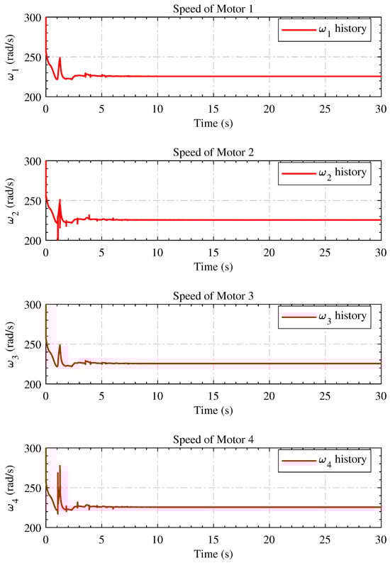 In Figure 7, the control inputs of the proposed scheme exhibit minimal chatter and oscillations compared with their counterparts, which demonstrate significant oscillations. Such oscillations pose risks to the integrity of a system and can degrade its dynamic performance. Stability and performance rely heavily on the initial values of the control inputs and angular velocities, with setting () and to establish a stable starting point. Precise tuning of controller parameters, such as , , , , , , , and , is crucial for effective control action that guides the system’s states towards the desired sliding surface. Additionally, parameters such as , , , and are specifically chosen to enhance the robustness of the system against matched uncertainties.
