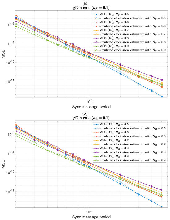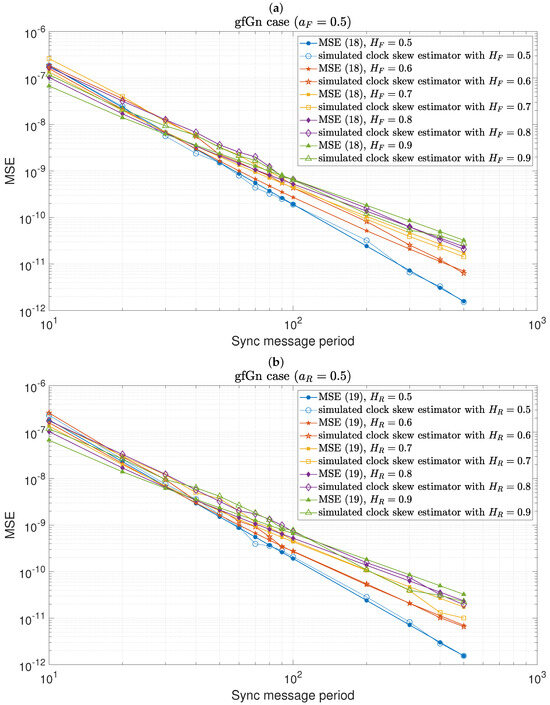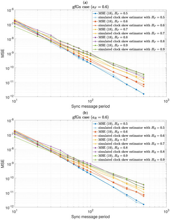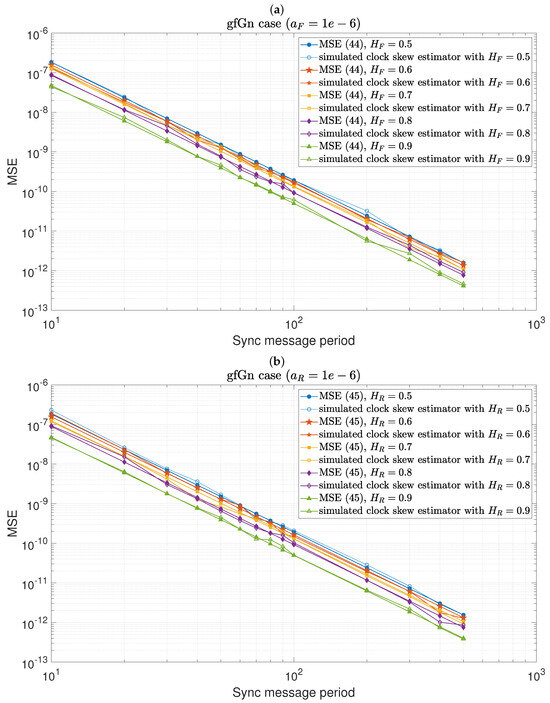 Figure 5 illustrates the performances of the clock skew estimators (5) and (6) compared to the closed-form estimates that approximate the MSE when : (44) and (45). According to Figure 5, for , those MSE expressions closely align with the simulated clock skew estimators’ performances. As was noted in Section 3, when the a parameter tends to zero and the Hurst exponent parameter increases, the closed-form estimates that approximate the MSE demonstrate better performances compared to the performances obtained with the MSE expressions valid for the Gaussian case. Indeed, Figure 5 illustrates this phenomenon.