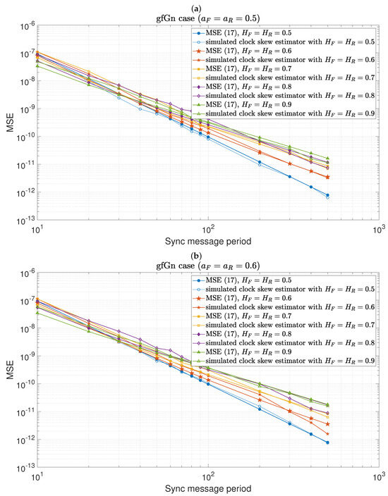 In this study, we tested our new closed-form approximated expressions for the MSE (17)–(19) for the gfGn case against the simulated results obtained from the clock skew estimators performances from the MSE perspective. Initially, we present simulation results for various values of the a parameter, specifically those less than or equal to , to demonstrate the accuracy of the new MSE expressions for the gfGn case when , including the special case where the a parameter tends to zero. Subsequently, we analyze simulation results for a parameters greater than () to illustrate the applicability of the new MSE expressions for cases where a is less than or equal to .