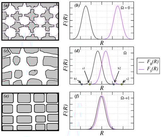 Equations (5) and (3) are now well-determined and illustrate that the degree of overlap between and is related to the correlation function (correlation is understood here as how sites and bonds are grouped or connected along the porous network as the overlap of the size distribution functions changes without violating the CP). Figure 1a schematizes a porous medium whose site and bond sizes are well-differentiated by the lack of overlap () between the distribution functions (Figure 1b). Using those sizes in network construction could only result in an uncorrelated network. In contrast, Figure 1e shows the extreme case, where the bonds are almost the same size as the sites, so the overlap is almost complete () between the size distribution functions (Figure 1f). Using those sizes in construction could only result in a highly correlated network. Finally, Figure 1c shows the intermediate case where the size of the sites and bonds is variable (from very small to very similar), so the size distribution functions (Figure 1d) partially overlap (). Using those sizes in network construction could only generate a moderately correlated network. It is important to note that the degree of correlation in the porous media is a complex and decisive factor that influences many capillary processes. For example, a higher correlation can lead to a more rapid invasion of wetting or non-wetting fluids. In contrast, a lower correlation favors delayed invasion or entrapment of fluids in the porous medium [,].