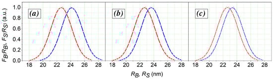 Size distribution functions of bonds (red line) and sites (blue line) for the 3D correlated nanoporous networks constructed using the Monte Carlo method and considering the parameters in Table 1: (a) NA (), (b) NB (), and (c) NC ().