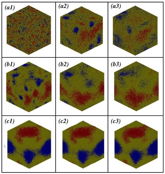 3D networks constructed using a Monte Carlo method. Random exchanges of sites and bonds cause changes in configurations. Large pores (sites and bonds) are in red, medium-sized pores are in yellow, and tiny pores are in blue. (a1,a2,a3) correspond to (NA-1, NA-8, NA-12), respectively, (b1,b2,b3) represent (NB-1, NB-8, NB-12), respectively, and (c1,c2,c3) are (NC-1, NC-8, NC-12), respectively.