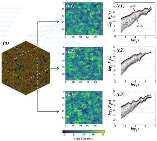 A representative porous network (a) and three slices perpendicular to the three Cartesian axes resulted in three images (panels (b1–b3)). The – plot of generalized detrended fluctuation function vs. scale s (panels (c1–c3)) for the images shown in (b1–b3) and q values within the interval . Here, the slope of the linear regression of each curve represents the scaling exponent or Hölder’s exponent .