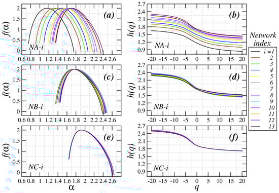 For NA networks (Figure 5a), we observe changes in the multifractal spectrum as the MCS increases, i.e., the range of scaling exponents () for which a fractal dimension exists shifts to the right, suggesting that the structure becomes more regular. Notably, for the network index , the spectra tend to be increasingly overlapping (similar range), indicating that the distribution of the porous elements shows a saturation level from this value onward. The above is confirmed by the behavior of the local Hurst exponent () in Figure 5b, where it is observed to be a monotonic decreasing function of q, and its value increases as the simulation evolves. In contrast, for the networks, a slight shift of the spectrum to the right is identified as the network index increases (Figure 5c,d), while for networks, no changes in the spectra are identified as the number of permutations increases (Figure 5e,f). Our results show that, for the set of simulated networks with the lowest overlap between the distributions (), the local exponents are sensitive to the changes originated by the random exchanges of the elements. In contrast, the fractal dimensions associated with these local exponents display a similar behavior (almost identical convex shape). On the other hand, when the overlap increases (), the local exponent does not show sensitivity to increasing element exchanges, even when the number of MCSs is large.