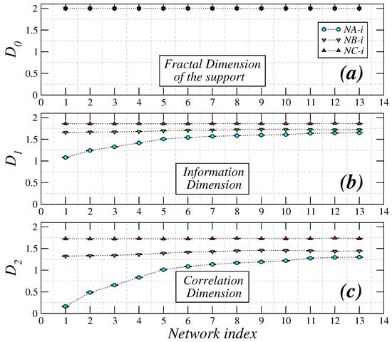 Evolution of the generalized dimensions . (a) Fractal Dimension Support (). (b) Information Dimension (). (c) Correlation Dimension ().