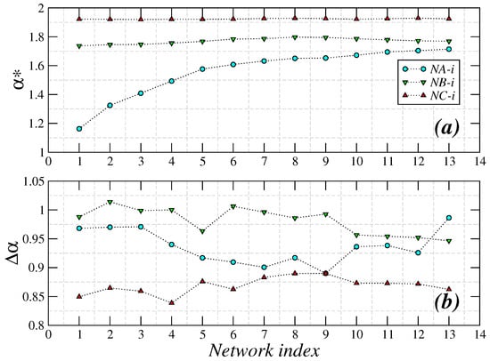 Figure 7a provides insight into the evolution of the singularity strength , i.e., the exponent with the most significant presence in the network. This exponent exhibits behavior similar to that observed for the generalized dimensions (see Figure 6b,c), revealing that networks constructed with the lowest overlap () are the most sensitive to random element exchanges or MCSs. It should be noted that, throughout the simulation, is valid, which confirms that networks with high overlapping distributions lead to configurations with a higher level of regularity compared to the case where the correlation is lower. Regarding the width of the spectrum (Figure 7b), we observe that the networks exhibit the largest width throughout almost the entire evolution, followed by the and the , with the width for the being slightly smaller. However, at the end of the evolution (), the network reaches a greater width than those corresponding to and .